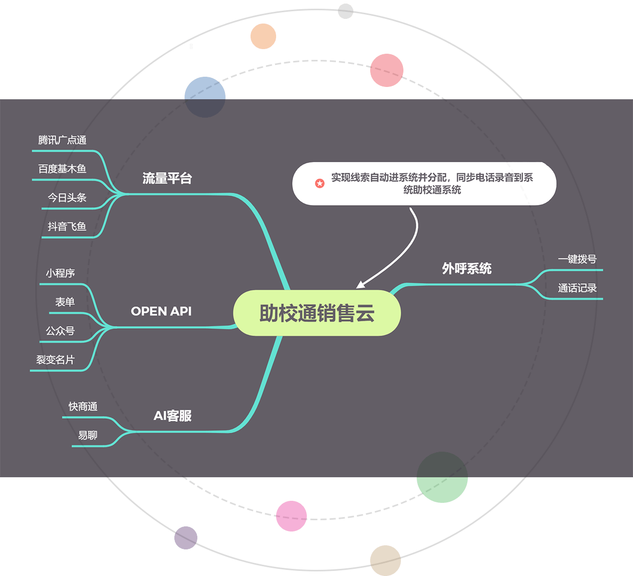 助校通销售云优势:CRM对接各大广告平台、AI在线客服等。实现线索名片7*24小时自动进线,降低人工成本。无缝对接意向客户和招生老师,做到及时跟进,提高客户满意度。